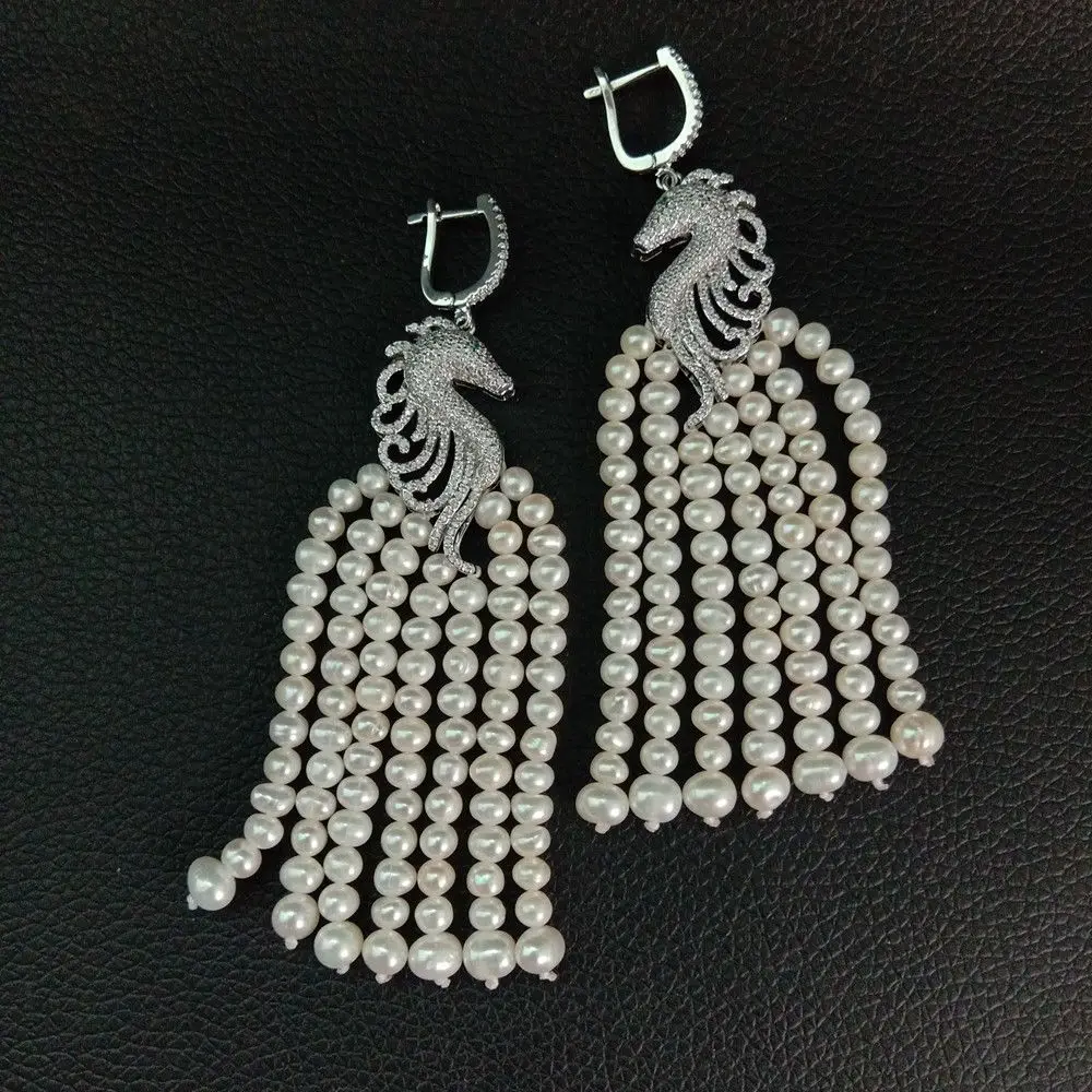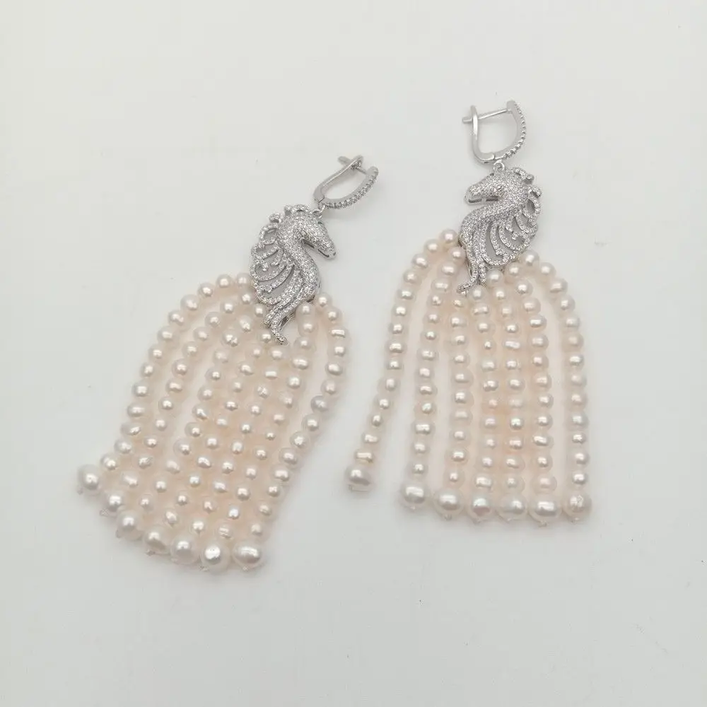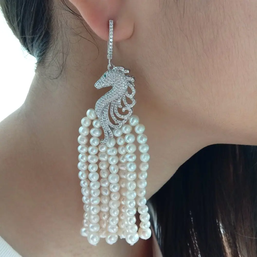 Hot Sale White Pearl White Golden Plated Cz Pave Sea Horse Earrings