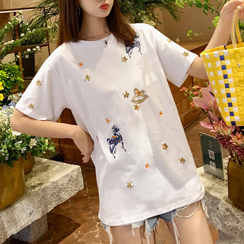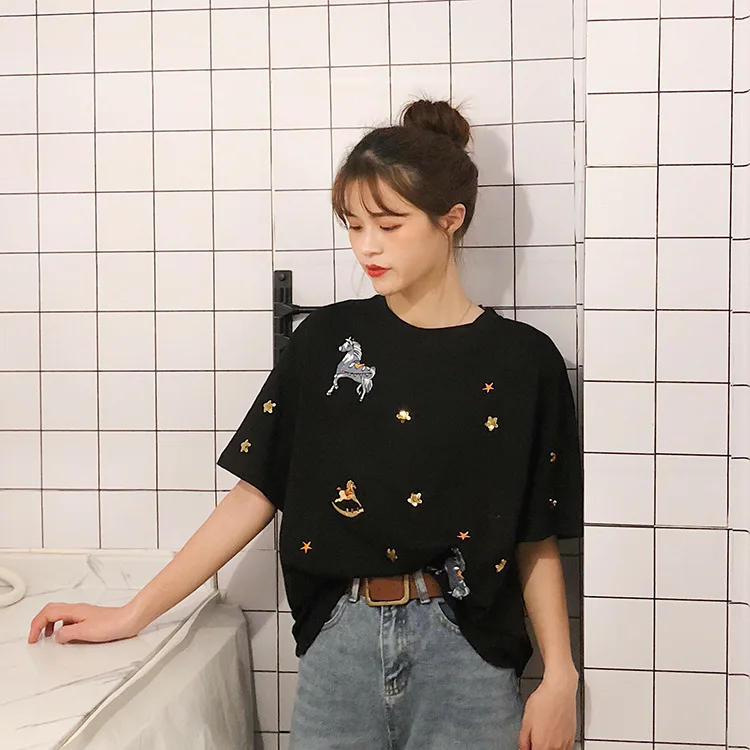 Review WOMEN'S T-shirt College Style Students Korean-style WOMEN'S Wear Dreams as Horses Loose-Fit Short-s